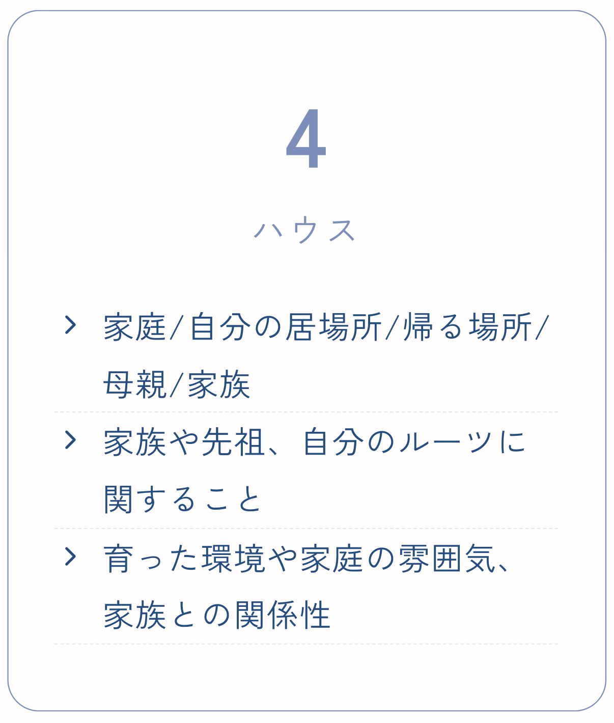 家、家族、心の基盤、そして「安心できる居場所」に関わる場所です。