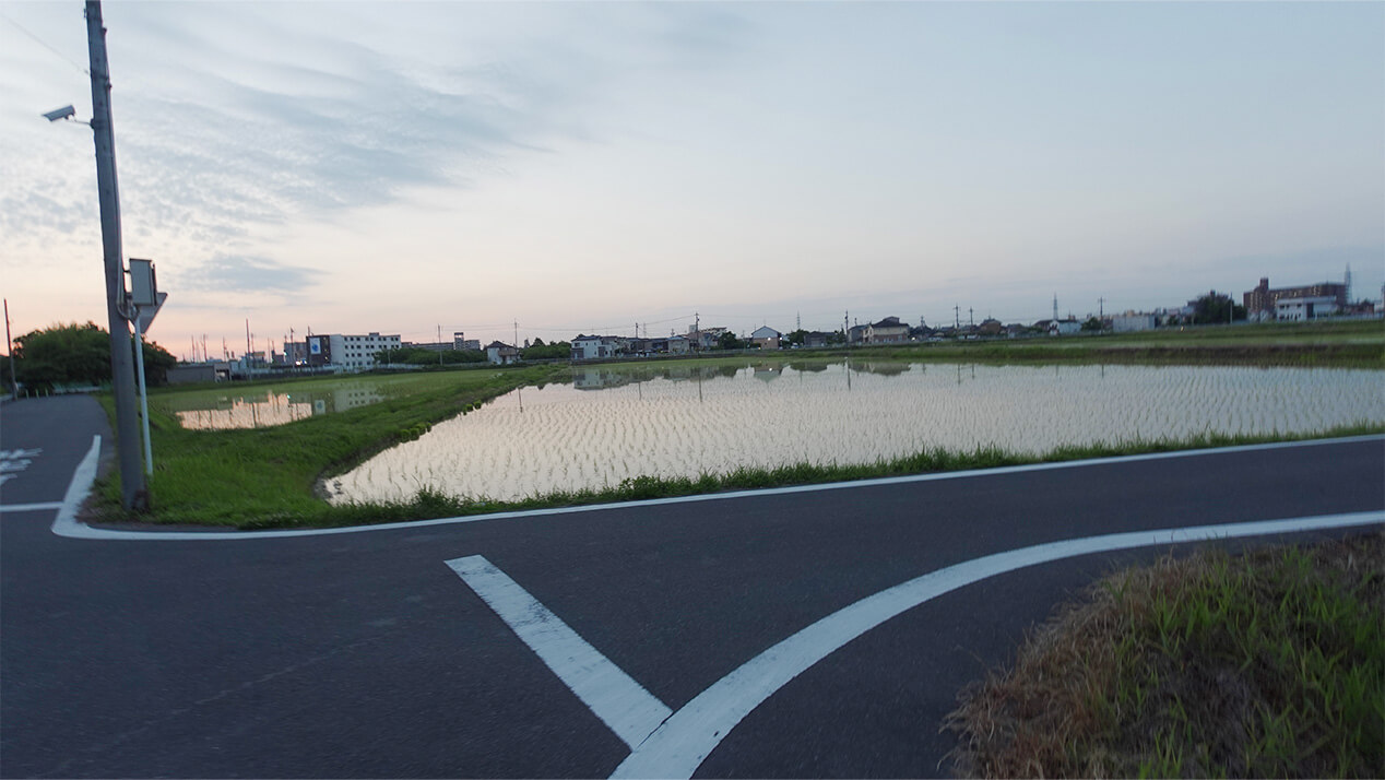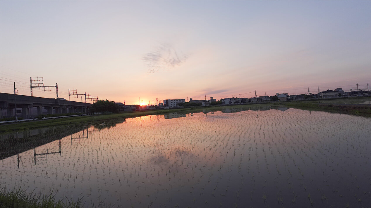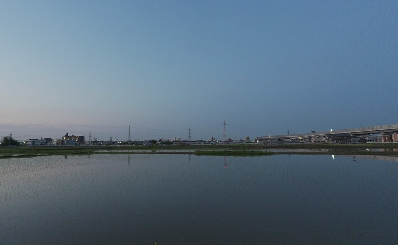 水を張った田面(たづら)には、空も、まわりの風景も、人工物までもが映し出されていて、まるで鏡のよう。