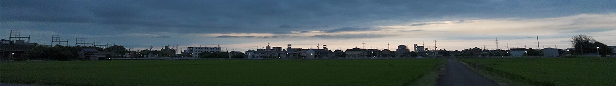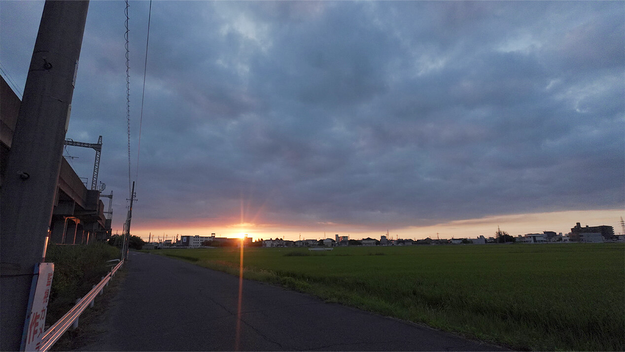 緑の田んぼと青い空、そして朝日がもたらすオレンジ色の光。