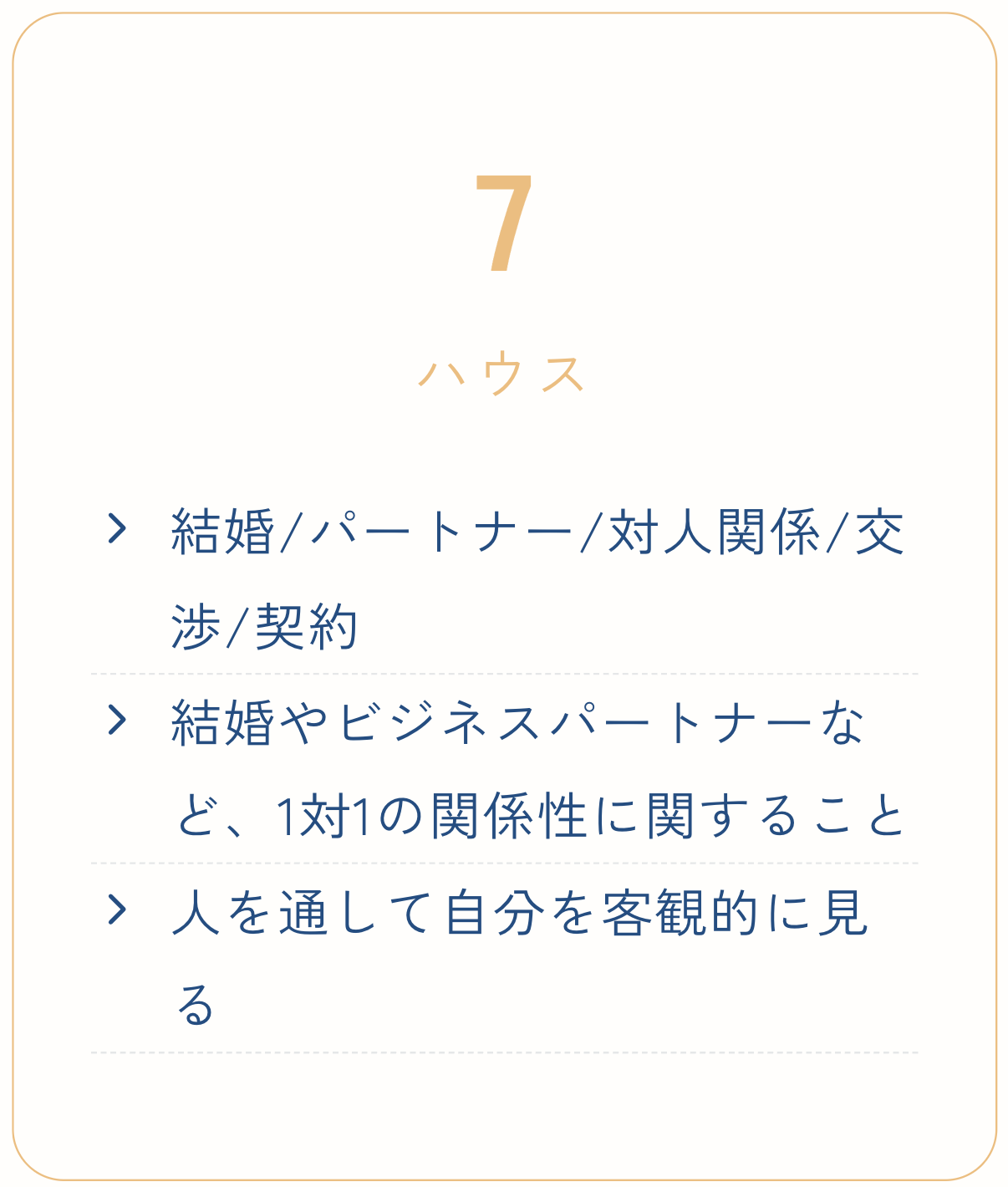 パートナーシップ、対人関係、契約など、1対1の関係性をあらわす場所です。